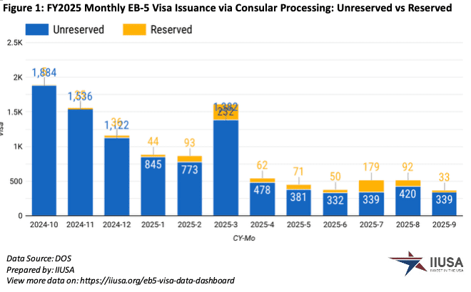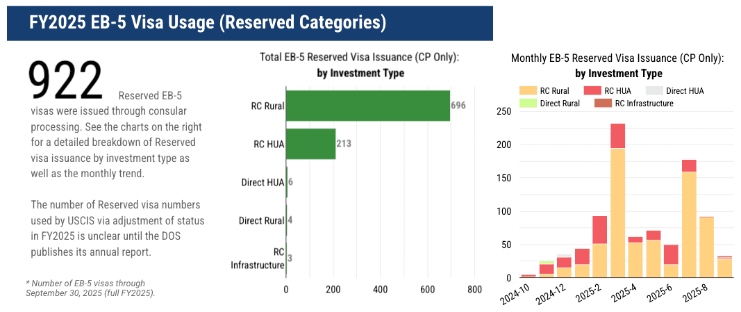 Overall in FY2025, the State Department issued a total of 9,831 Unreserved EB-5 visas and 922 Reserved visas (see Table 1). While 100% of Unreserved visas were fully utilized during the fiscal year, only 13% of the available Reserved visas were issued via consular processing (excluding adjustment of status (AOS) usage).
