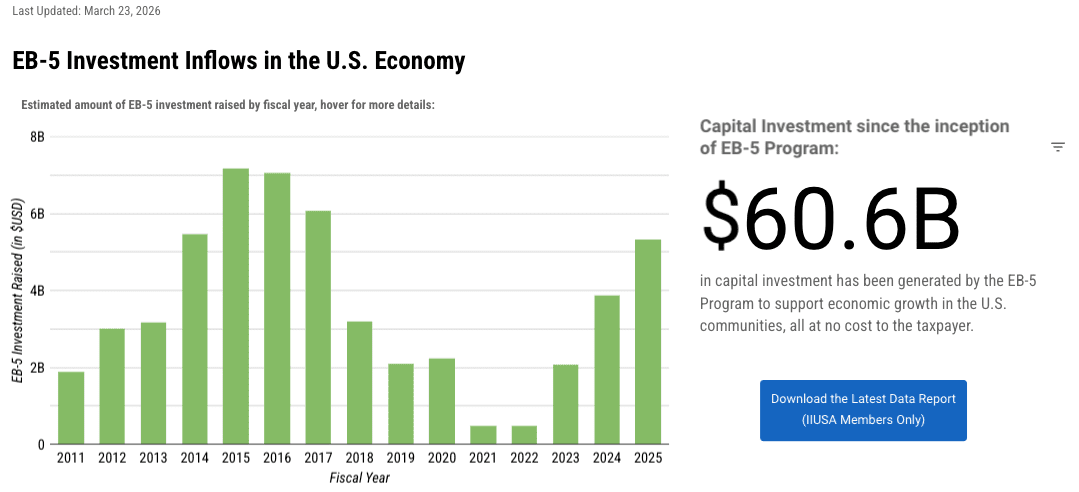 - Record Filings and Adjudications: FY2025 set a new high, with 6,660 case filings and 3,439 adjudications. Since the enactment of the RIA, it’s estimated that 14,500 petitions have been filed, while approximately 4,300 I-526E petitions have been approved. Overall, EB-5 investment inflow reached an estimated $5.3 billion in FY2025, bringing total post-RIA capital formation to nearly $12 billion and highlighting the EB-5 Program’s continued economic impact.