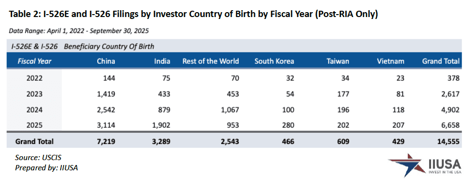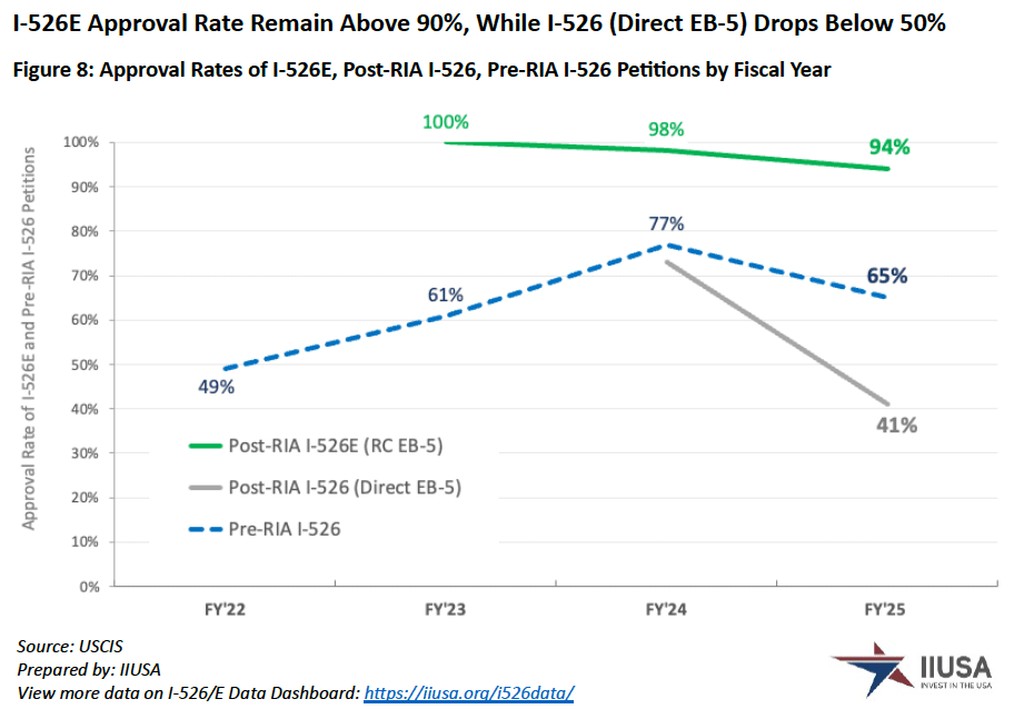 - Post-RIA Approval Rates: I-526E approval rates remain consistently high (94%) in FY2025, while direct EB-5 (I-526) approval rates dropped to 41%.