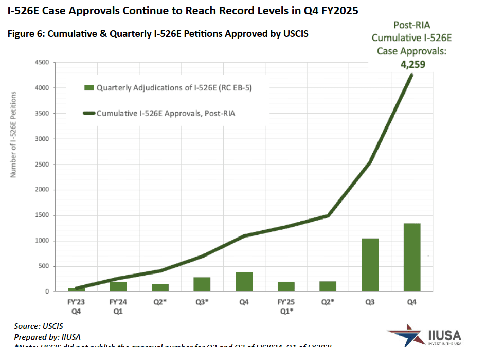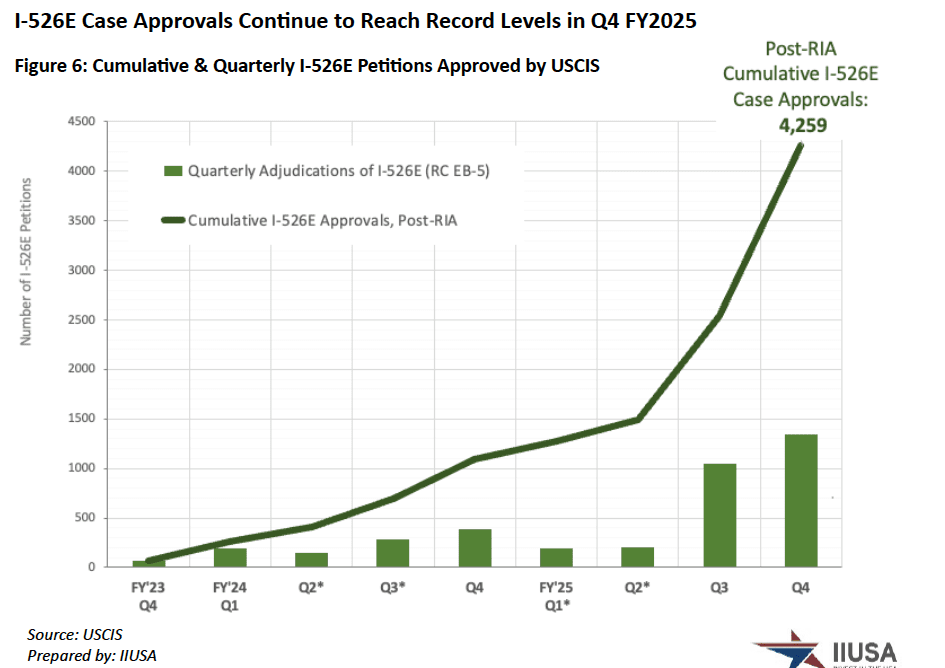 - I-526E Approvals Continue to Surge: USCIS approved more than 1,300 I-526E petitions in Q4 FY2025, representing a 30% increase from Q3, when approvals had already reached a post-RIA quarterly record.